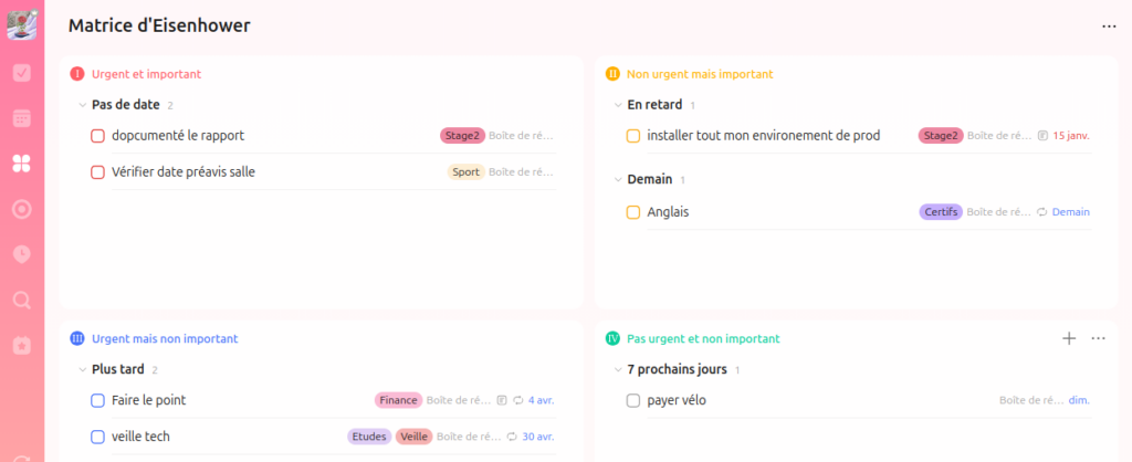 Cet outil me permet de créer des taches trier par étiquettes par importance grâce a une matrice Eisenhower