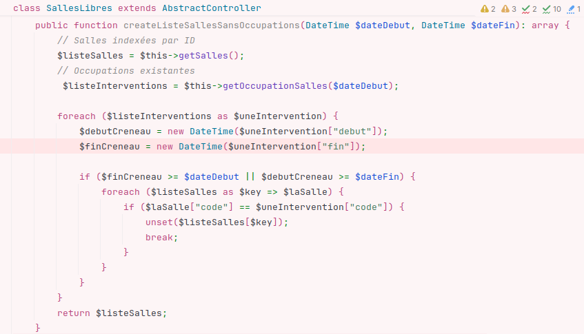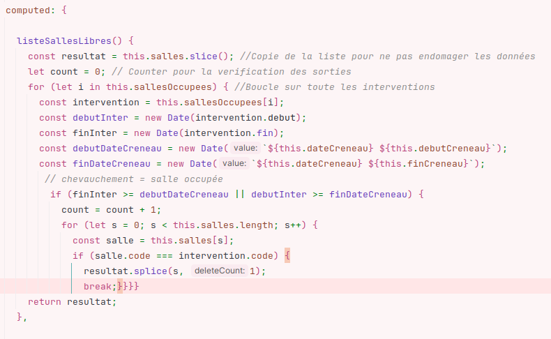 | Chargement et requêtage de données systématiques aux changements du formulaires | Code de l’algorithme de tris des salles libres dans le Back | Création de l’algorithme en JS dans le Vue et non dans le fichier de services PHP en parallèle du contrôleur |