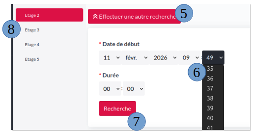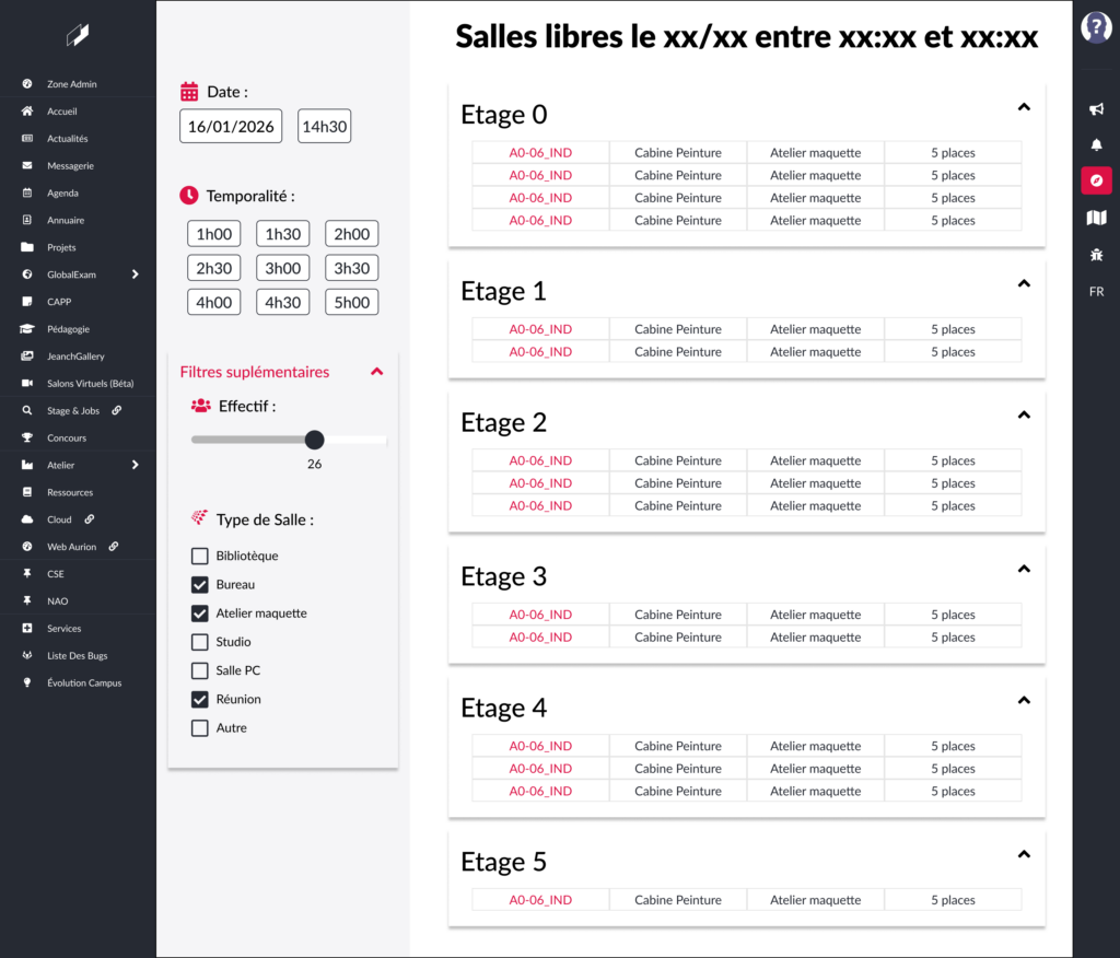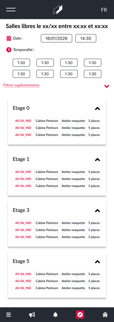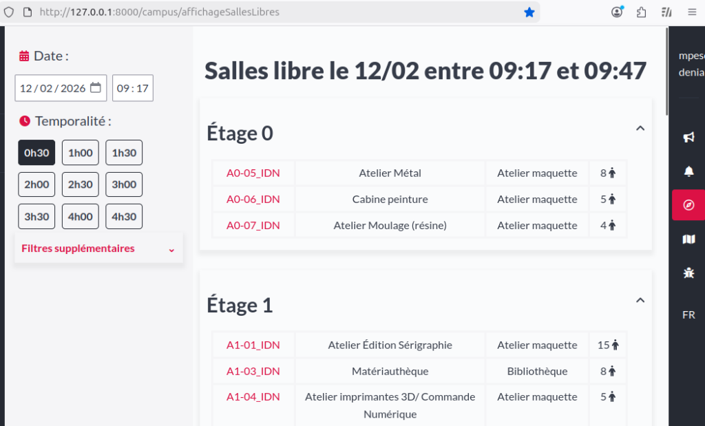 La page actuelle affiche les salles disponibles et possède 2 moyens de les filtrer : la date (jour, mois, année, heure, minute) et une durée (heure-minute). Le problème actuel de cette page est qu’elle est :