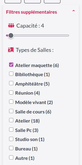 - Le type de salles (ex : Amphithéatre, Atelier maquette, Réunion, ect…)