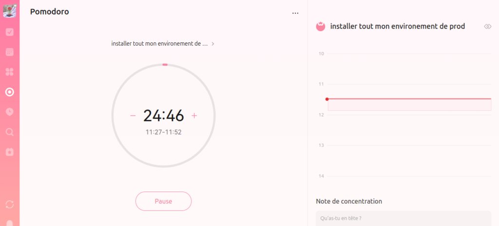 Je peux également lancer un timing pomodoro pour cette tache. Je peux ainsi connaître le temps que j’ai pris pour la réalisée.