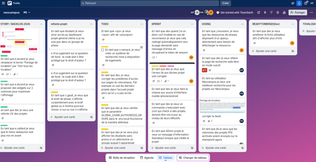 Le suivi de taches se fait sur Trello, dans lequel nous avons plusieurs colonnes selon le statut de la tâche à effectuer
